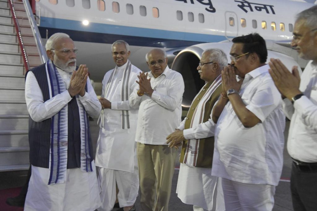 વડાપ્રધાન શ્રી નરેન્દ્રભાઇ મોદી ગુજરાતના બે દિવસીય પ્રવાસે આવ્યા છે. વડાપ્રધાનશ્રી સાંજે અમદાવાદ એરપોર્ટ પર પધાર્યા ત્યારે રાજ્યપાલ શ્રી આચાર્ય દેવવ્રત અને મુખ્યમંત્રી શ્રી ભૂપેન્દ્ર પટેલે તેમનું ઉષ્માસભર સ્વાગત કર્યું હતું.