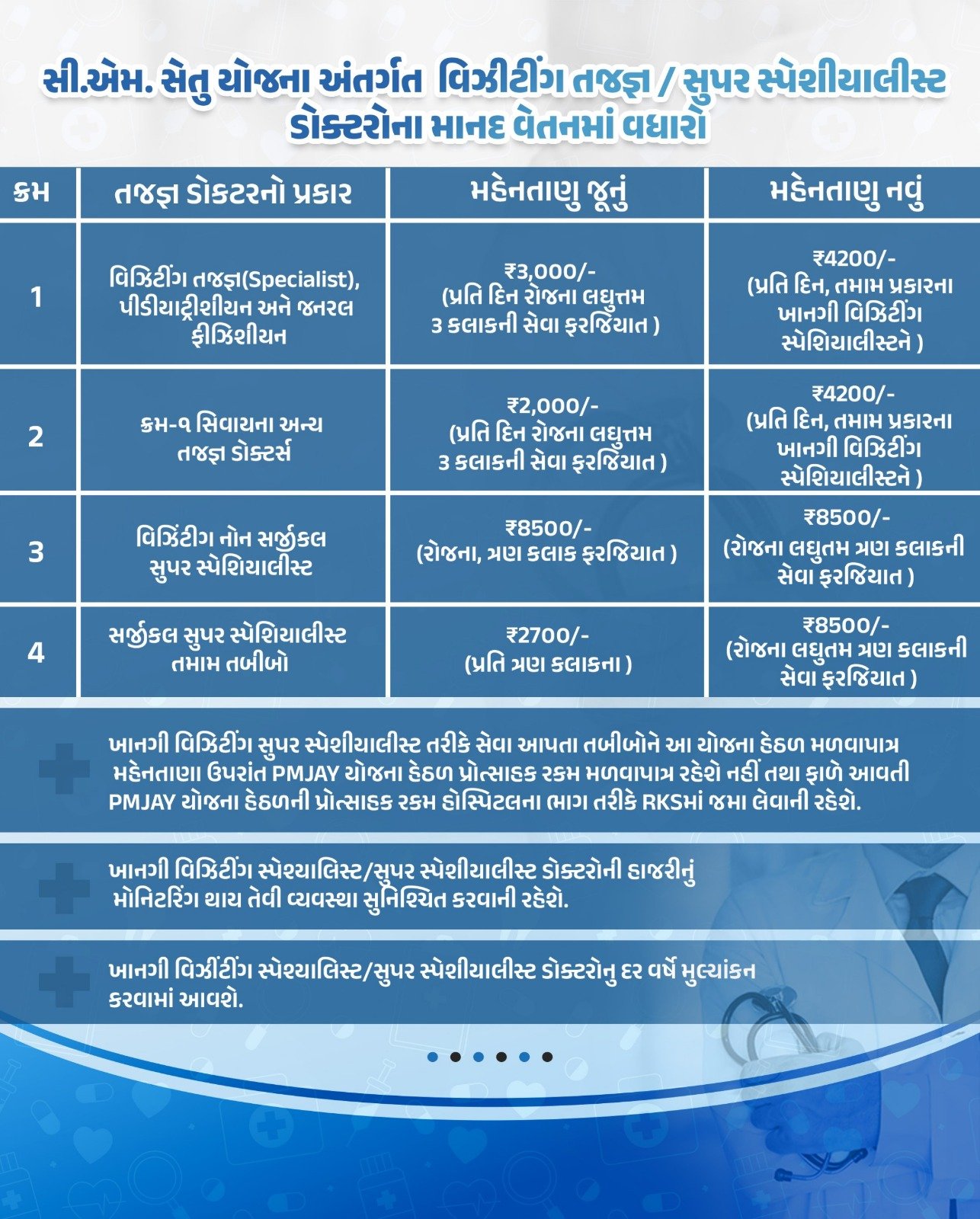 મુખ્યમંત્રીશ્રી ભુપેન્દ્ર પટેલના અધ્યક્ષસ્થાને રાજ્ય મંત્રીમંડળની બેઠકમાં સી.એમ.સેતુ યોજના અંતર્ગત એક મહત્વપૂર્ણ નિર્ણય કરવામાં આવ્યો છે. જે અંતર્ગત રાજ્યની જિલ્લા હોસ્પિટલો, પેટા જિલ્લા હોસ્પિટલો અને સામૂહિક આરોગ્ય કેન્દ્રોમાં સેવા આપતા વિઝીટીંગ તજજ્ઞ-Specialist ડોકટરોના માનદ વેતનમાં વધારો કરવામાં આવ્યો છે.