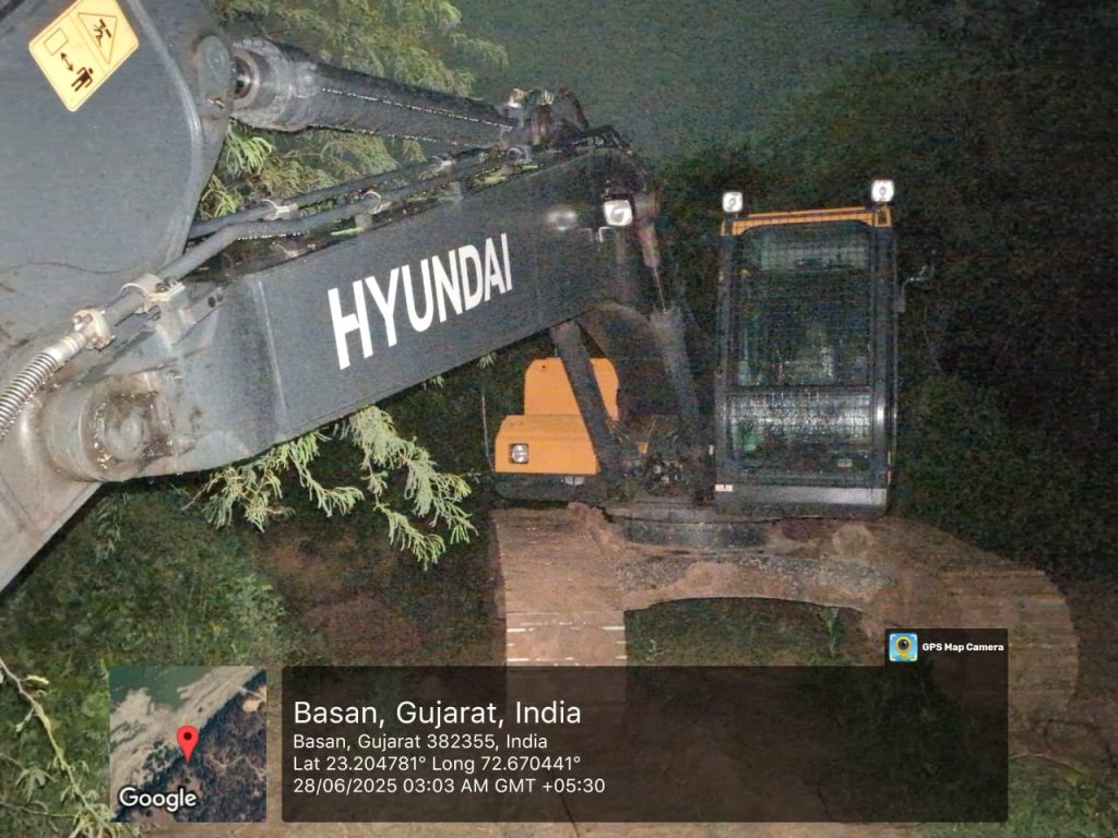 વધુમાં કચેરીના માઈન્સ સુપરવાઈઝરશ્રી દ્વારા રાત્રીના સમયે આશરે ૦૪:૦૦ વાગ્યાના સુમારે બાસણ ખાતે સાબરમતી નદીપટ્ટ વિસ્તારમાં આકસ્મિક તપાસ હાથ ધરતા ૦૧ હ્યુન્ડાઈ કંપનીનું એક્સેવેટર મશીન જેનો મોડેલ નં. Excavator R2151. જેનો પીન નં HYNDN635KE0070620L બંધ હાલતમાં જોવા મળેલ જેને આગળની તપાસ અન્વયેની કામગીરી માટે સીઝ કરવામાં આવેલ.
