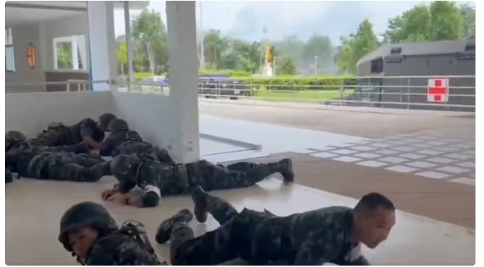 દ્રશ્યોમાં હોસ્પિટલ સંકુલની બહાર રોકેટ પડતાં જોવા મળ્યા હતા, જ્યારે થાઇ સૈન્ય જમીન પર છુપાયેલું હતું.