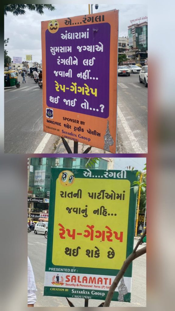 અમદાવાદ શહેરના કેટલાક વિસ્તારોમાં ટ્રાફિક જાગૃતિ માટે સતર્કતા ગ્રુપ દ્વારા અલગ-અલગ પોસ્ટરો લગાવવામાં આવ્યા હતા. જોકે, આ પોસ્ટરોમાં મહિલાઓને રાત્રે પાર્ટીમાં ન જવા અને દુષ્કર્મનો ભોગ બની શકે તેવી ચેતવણી આપતા લખાણો હતા. આ બેનર પર લખવામાં આવ્યું હતું કે ‘એ…રંગલા અંધારામાં સૂમસામ જગ્યાએ રંગલીને લઈ જવાય નહીં… ****** થઈ જાય તો….? અન્ય એક બેનરમાં લખવામાં આવ્યું હતું કે ‘એ…રંગલા રાતની પાર્ટીઓમાં જવાનું નહીં… ******* થઈ શકે છે.’ જેના પર ભારે વિવાદ થયો હતો. આ પોસ્ટરોમાં ઉપયોગમાં લેવાયેલી ભાષા અને સંદેશાને કારણે સોશિયલ મીડિયા પર પણ ટીકા થઈ હતી.