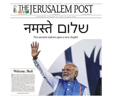 બુધવારે (સ્થાનિક સમય મુજબ) ઇઝરાયલની બે દિવસીય મુલાકાત પહેલા, ઇઝરાયલના અગ્રણી દૈનિક જેરુસલેમ પોસ્ટના પહેલા પાના પર વડા પ્રધાન નરેન્દ્ર મોદી મુખ્ય સ્થાન પર હતા. અખબારના મુખ્ય સંપાદક ઝ્વિકા ક્લેઇને સોશિયલ મીડિયા પર દિવસના આવૃત્તિના પહેલા પાના પર શેર કર્યું, જેમાં વડા પ્રધાન મોદી હાથ લહેરાવતા હોય તેવો ફોટોગ્રાફ હતો, સાથે તેમની ઇઝરાયલ મુલાકાત અને ભારત અને ઇઝરાયલ વચ્ચેના વધતા સંબંધો પર ધ્યાન કેન્દ્રિત કરતી અનેક વાર્તાઓ પણ હતી.